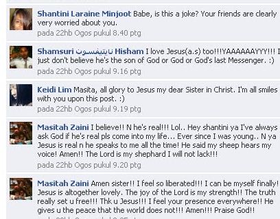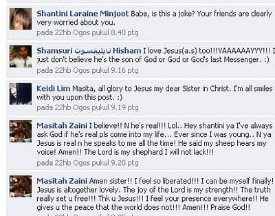 Klik dan baca imej dibawah ini, bacalah komen dari kawan-kawan Kristian Masitah Zaini yang membuat ulasan dalam wall tersebut. Apakah ini yang sedang berlaku di Malaysia? Semoga kita muhasabah diri selepas membaca komen-komen di FB ini